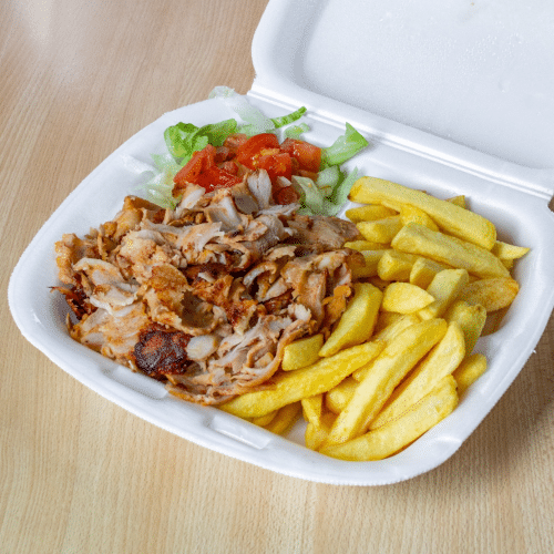 Schotel en met kipdöner, friet, saus en drankje naar keuze